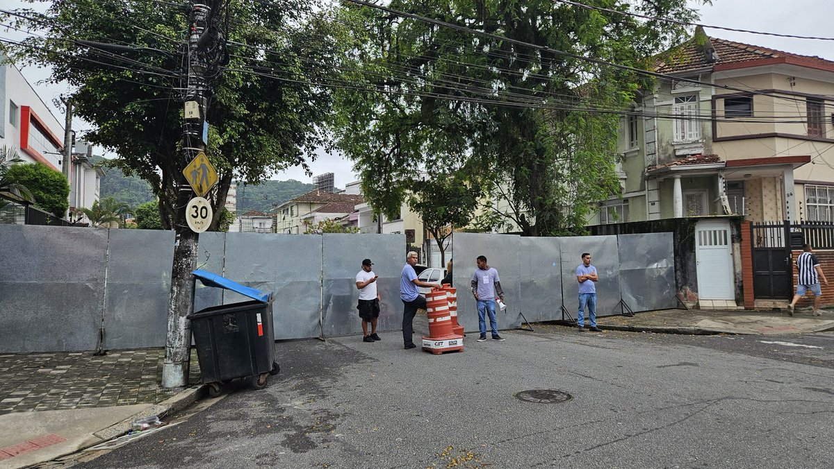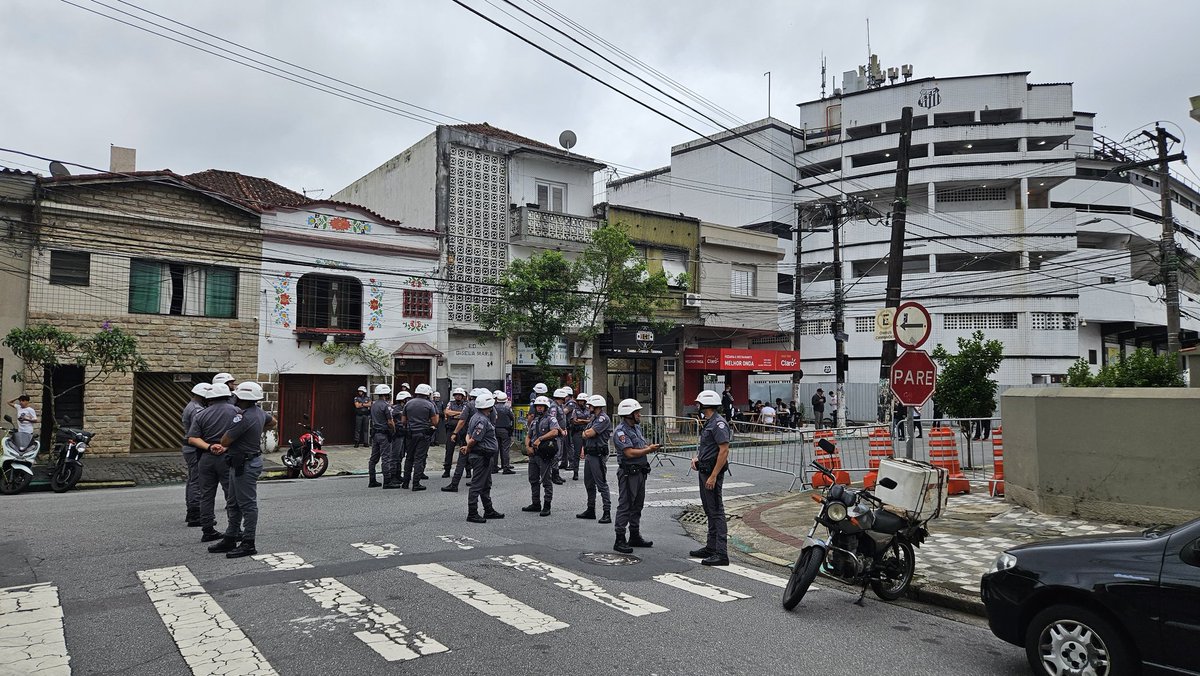 Segurança bem reforçada nos arredores da Vila Belmiro. Essa é a primeira barreira para a entrada da torcida do Vasco, na rua Guararapes. A partir desse ponto, só entram vascaínos. Mais na frente, na mesma rua, uma segunda barreira com grades e muitos PMs. @trivela