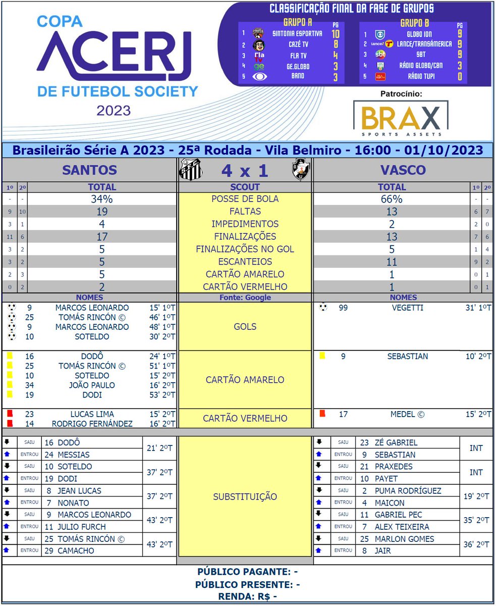 Cartões amarelos: Dodô, Rincón, Soteldo e João Paulo (Santos); Sebastián Ferreira (Vasco)