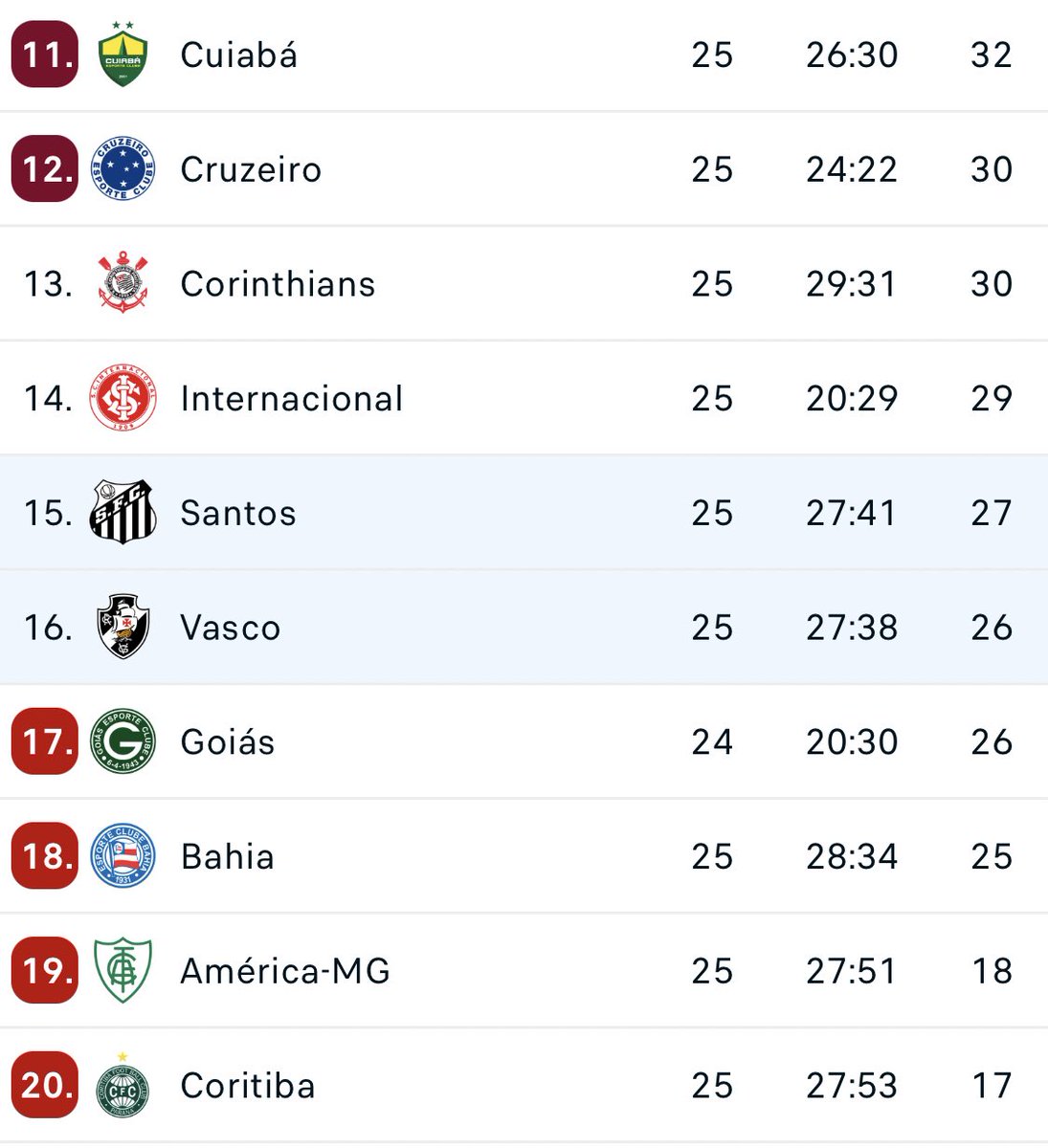 Tabela do campeonato atualizada referente à parte de baixo da tabela.