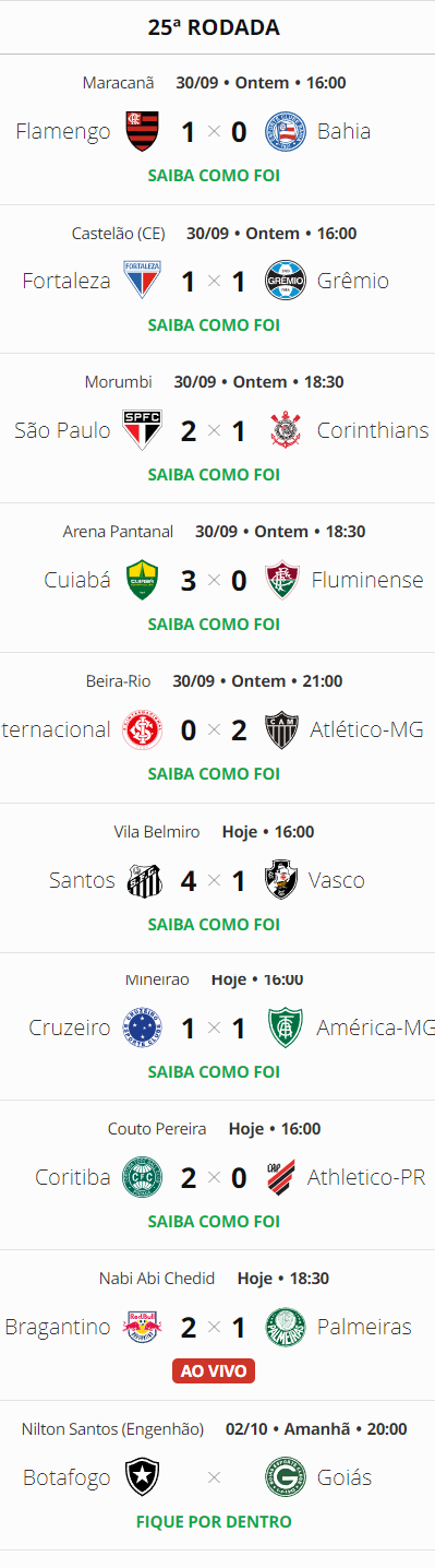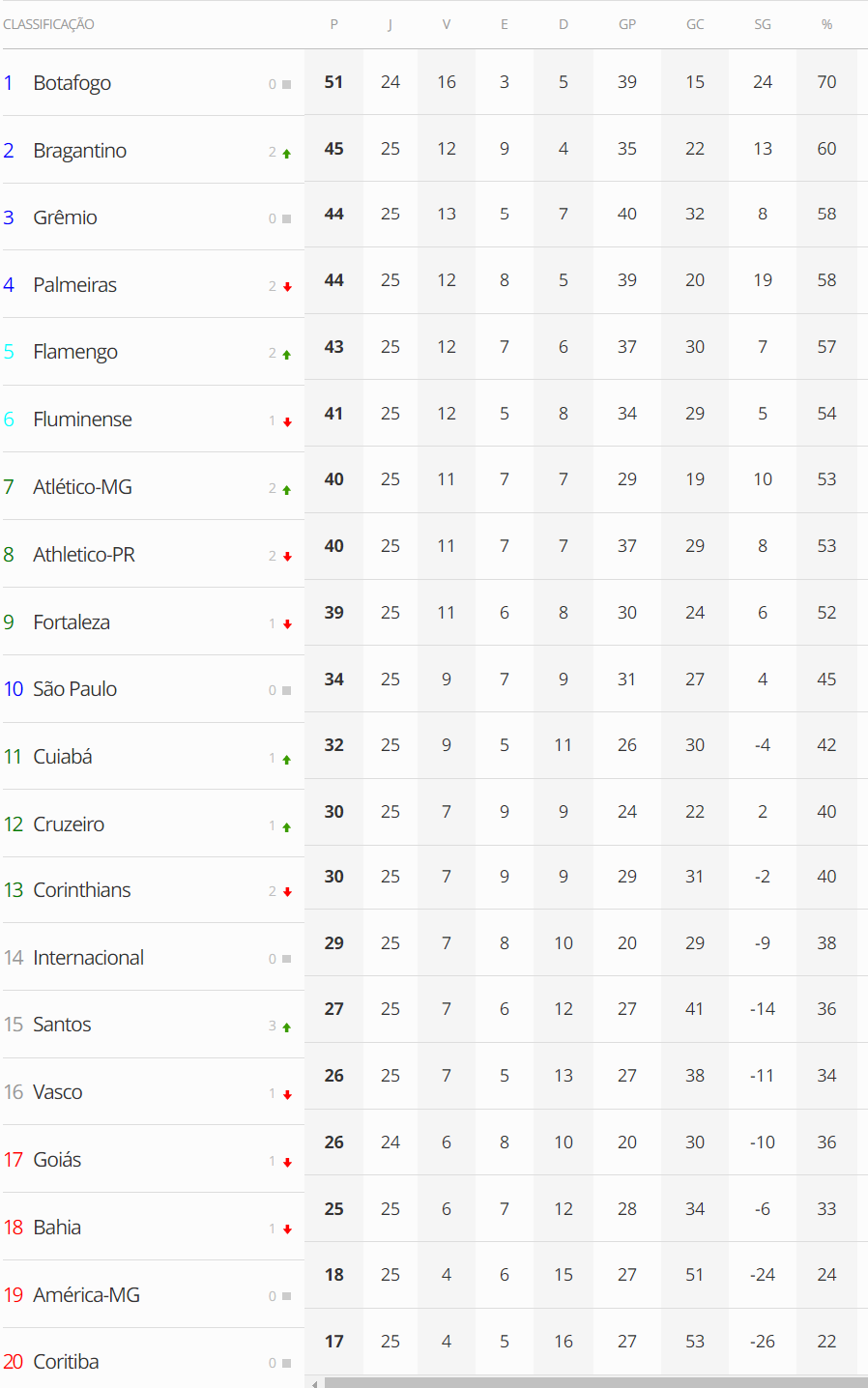 Confira a classificação após os jogos deste domingo do Brasileiro; Vasco está em 16º lugar