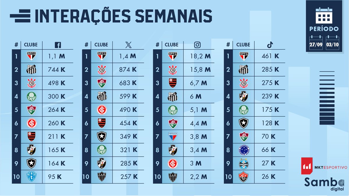 Incendiado por Soteldo, o @SantosFC gerou muito conteúdo no período, e alcançou a 2ª posição no TikTok e Facebook.