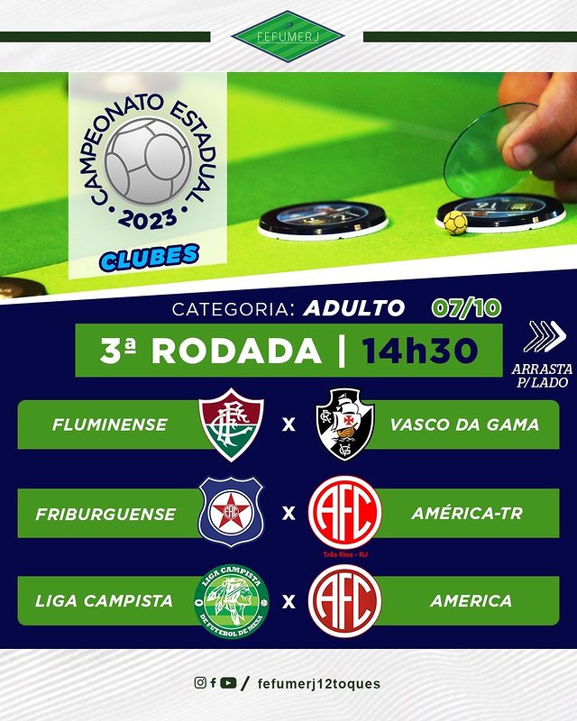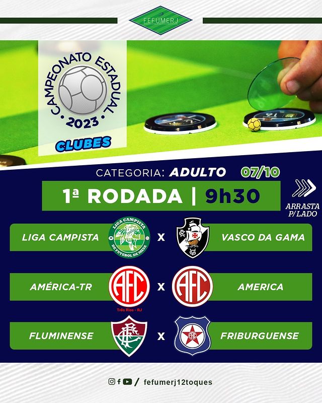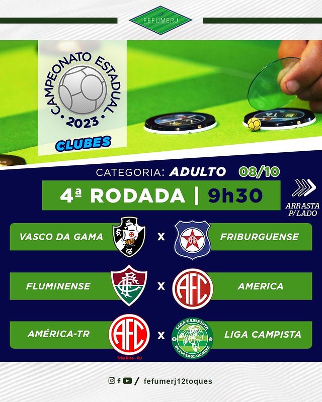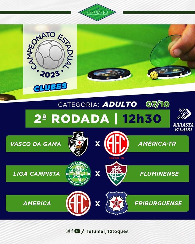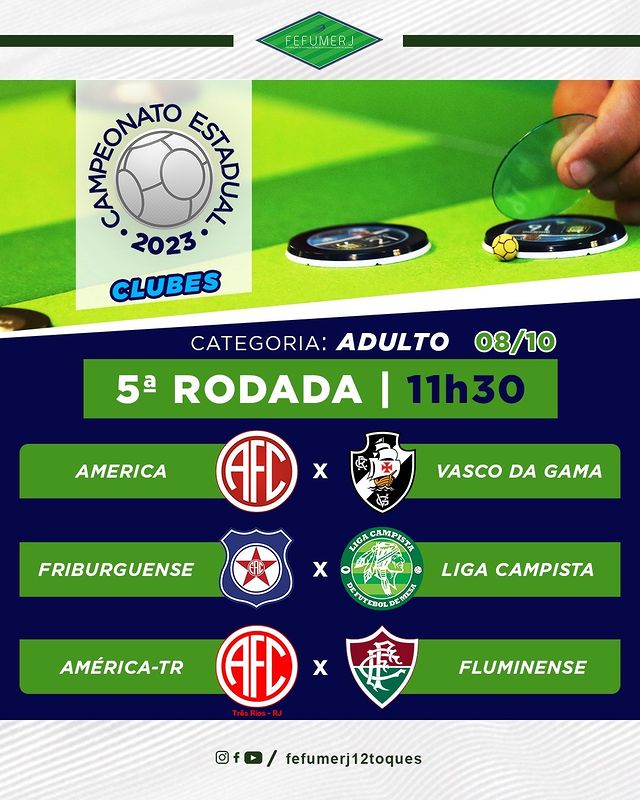America, America de Três Rios, Fluminense, Friburguense e Vasco disputam neste fim de semana, 7 e 8 de outubro, a Taça Rio – segundo turno do Campeonato Estadual Interclubes, promovido pela vice-presidência da modalidade 12 toques da Fefumerj – Federação de Futebol de Mesa do Estado do Rio de Janeiro.