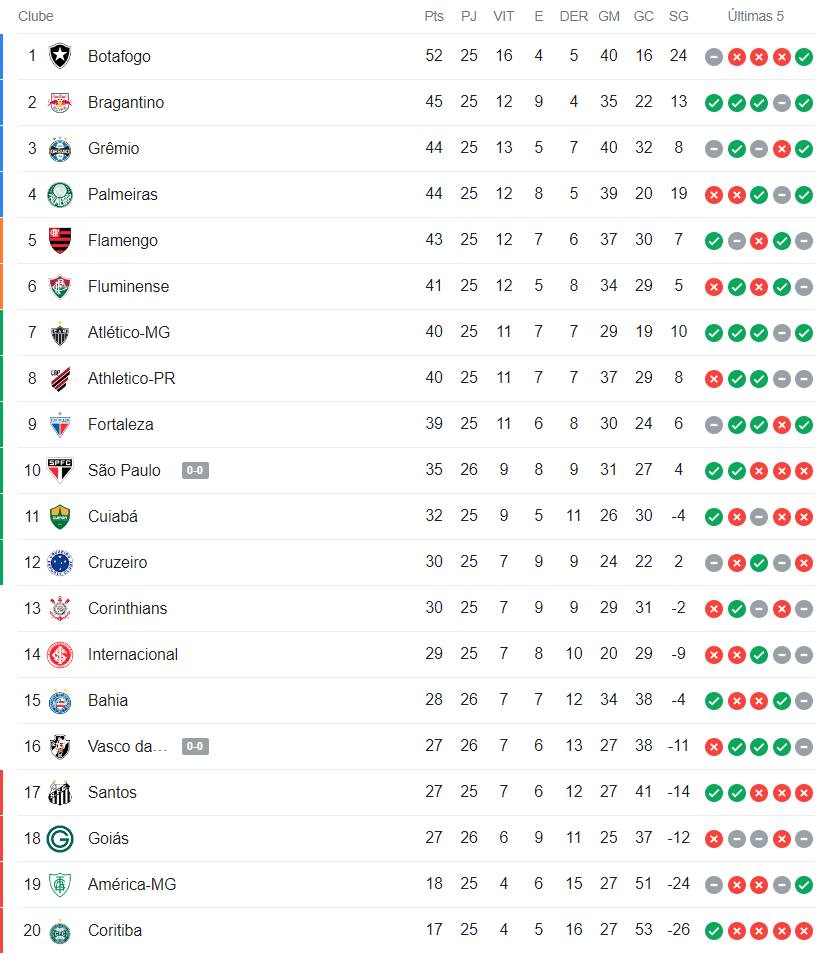 Com o empate contra o São Paulo, o Vasco deixou o Z4 pelo menos provisoriamente, pois a rodada ainda não acabou. O Santos visita o Palmeiras neste domingo e, se pontuar, recolocará o Gigante da Colina na zona do rebaixamento.