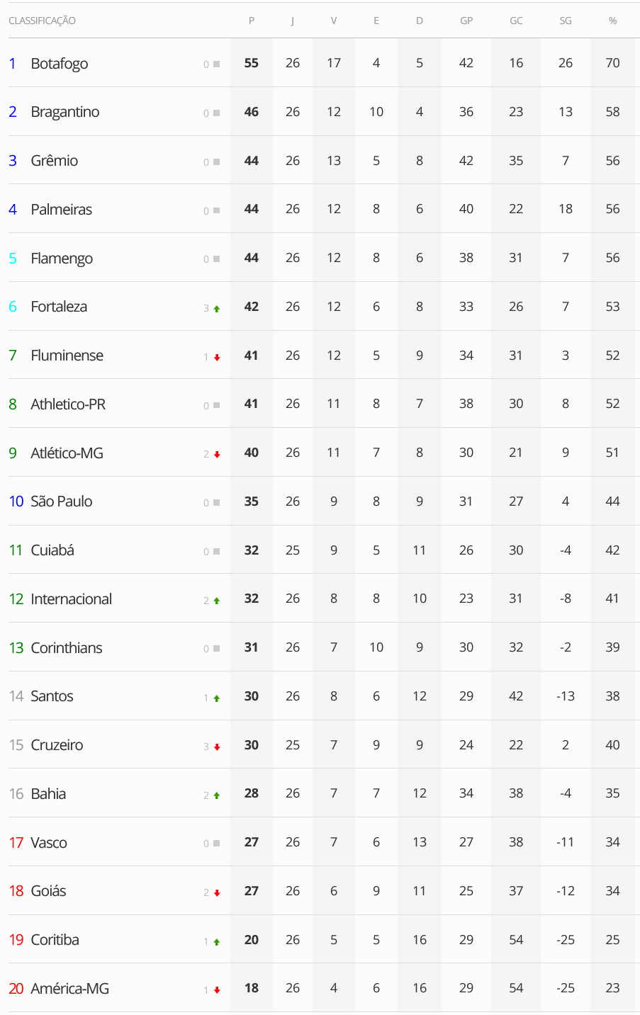 Confira a classificação após os jogos deste domingo do Brasileiro; Vasco está em 17º lugar