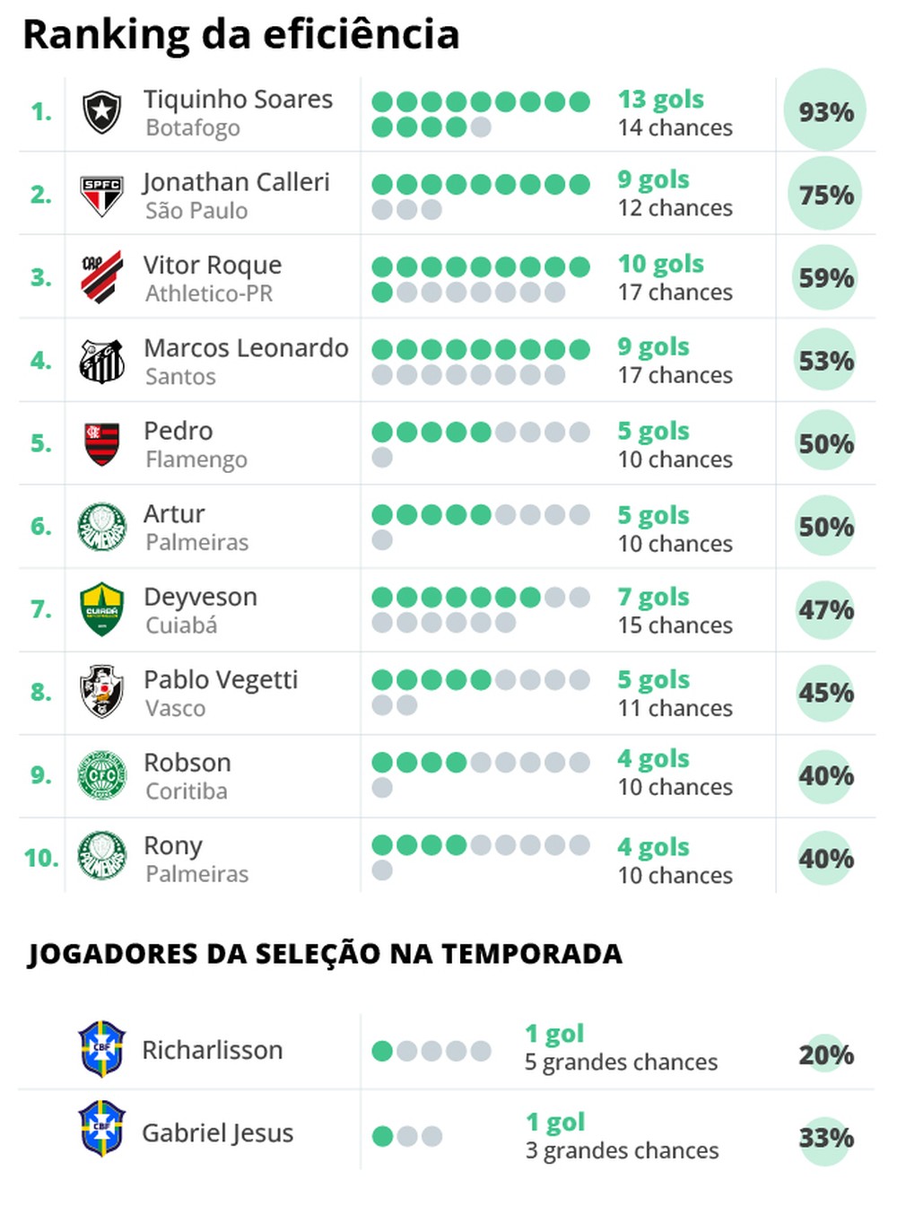 Para se ter ideia, Marcos Leonardo, vice-artilheiro do Campeonato Brasileiro com 12 gols, tem apenas 53% de conversão em chances claras. De 17 oportunidades, o jovem centroavante do Santos marcou em nove. Vitor Roque, terceiro na artilharia com 11 gols, tem 59% de aproveitamento com 10 gols em 17 chances.
