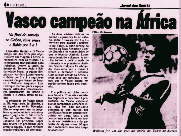 (13/10/1991) Exatos 32 anos, o Vasco da Gama conquistava o Torneio da Amizade, o seu primeiro título no continente africano, torneio quadrangular realizado em Libreville, capital do Gabão e na final vencia o Bahia por 2x1, gols de Sorato e William.
