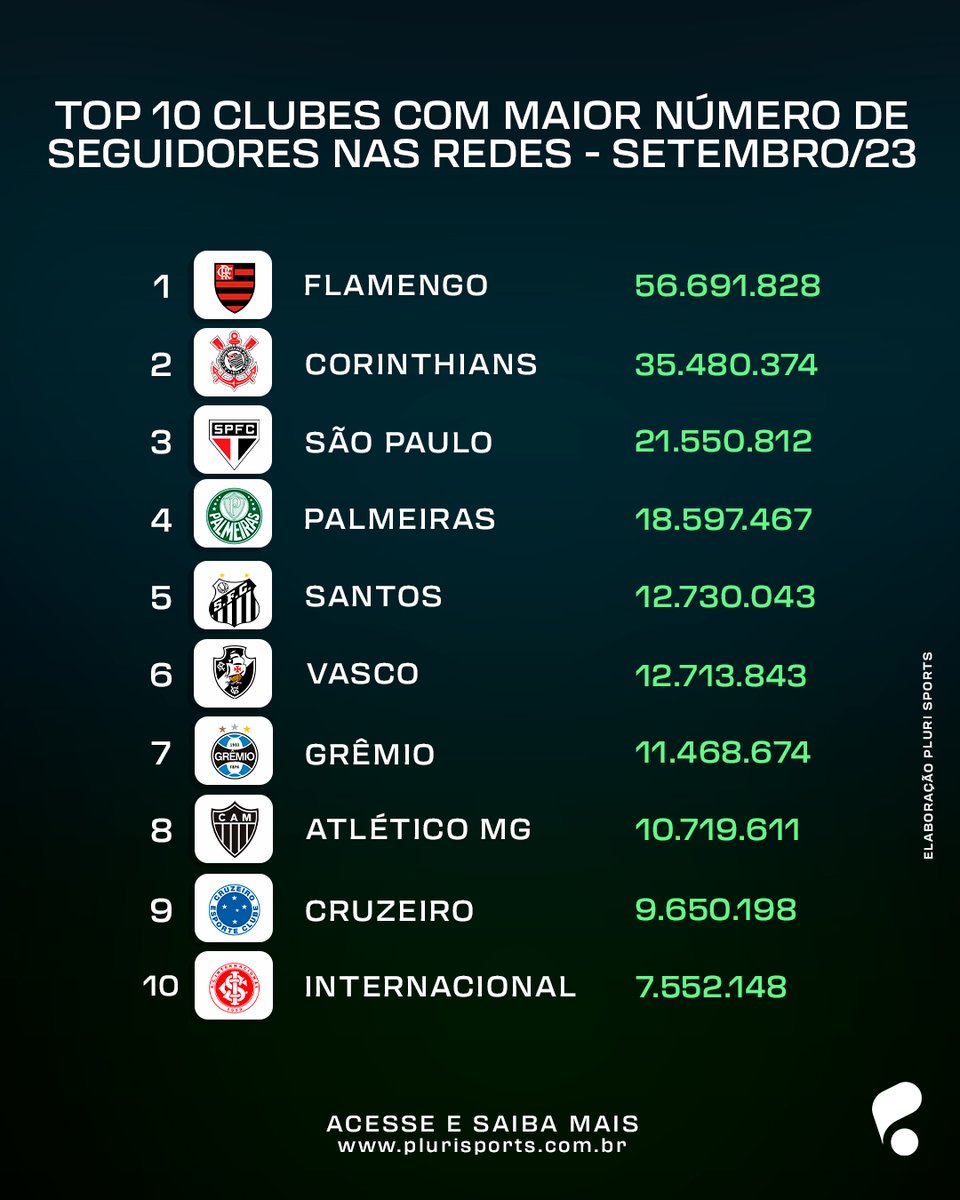 O Flamengo lidera o ranking, seguido pelos quatro grandes clubes de São Paulo. O Vasco, atualmente na sexta posição, está aumentando seus números e pode ultrapassar o Santos no próximo mês e conquistar a quinta posição.