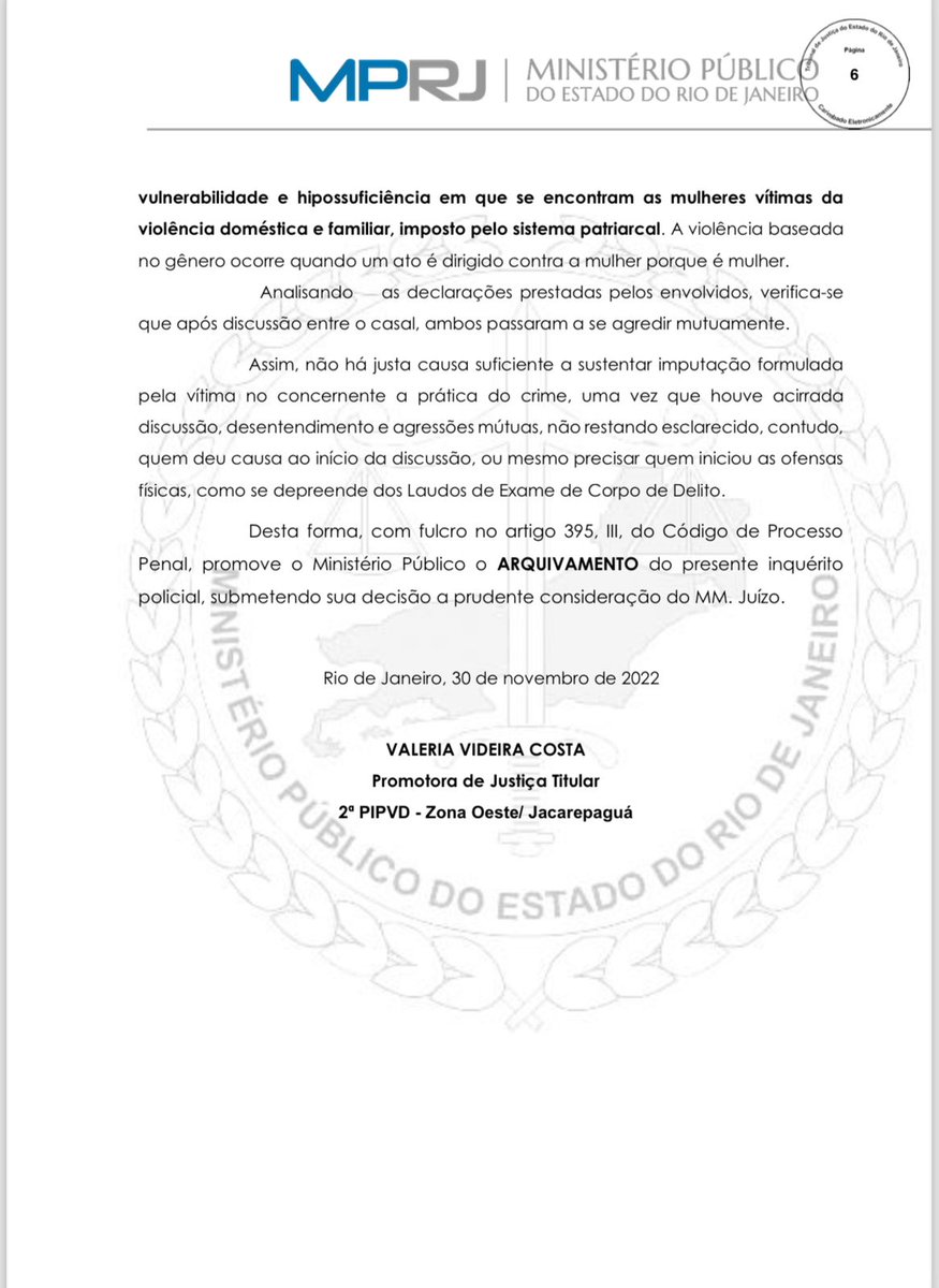 Ainda segundo o Ministério Público, ambos anexaram provas de agressão vinda dos dois lados, e que Leven e Gabriella chegaram às vias de fato, mas o caso não se adequa para ser indiciado à Lei Maria da Penha. O caso, portanto, foi arquivado.
