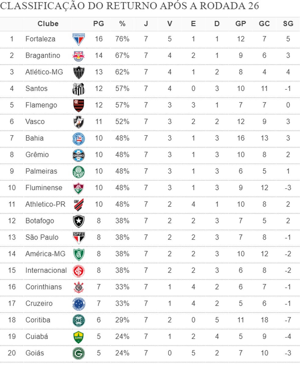 Após 7 rodadas, o Vasco é o 6º colocado no returno do Campeonato Brasileiro. Veja a classificação: