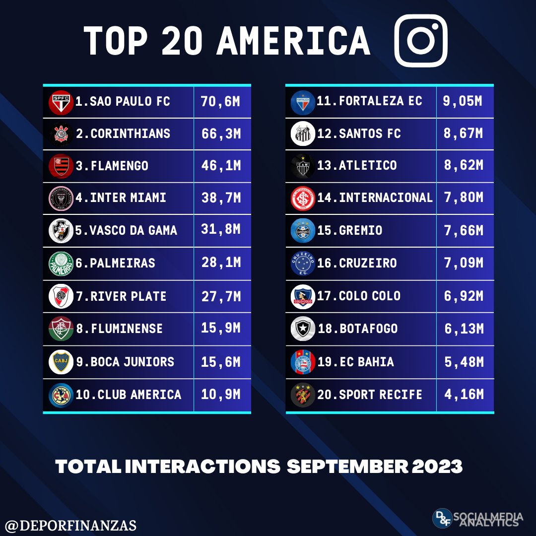 📲⚽ ¡Los 20 clubes de América con más interacciones en #instagram durante septiembre 2023!💙💬