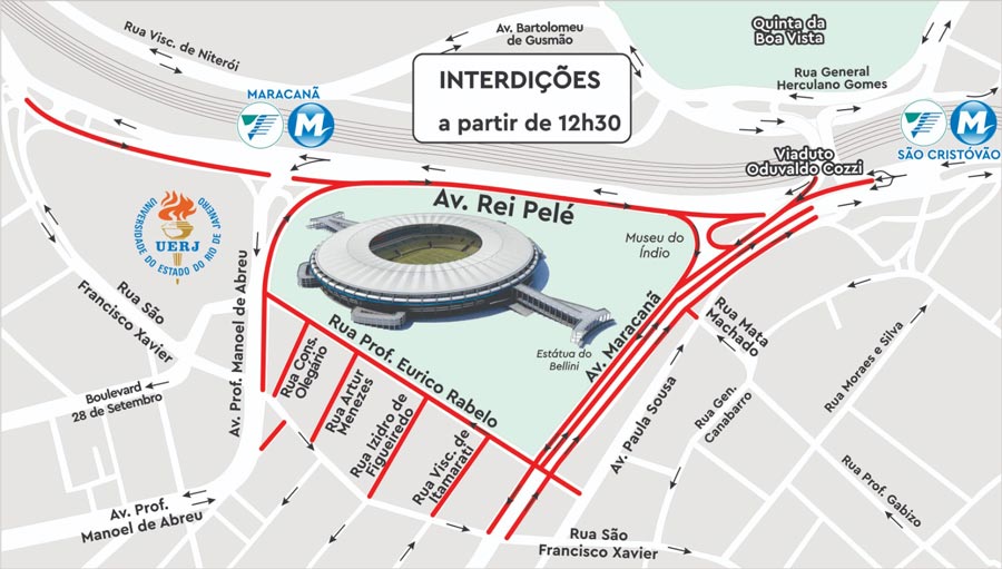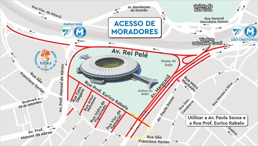 O acesso de moradores com veículos, que residem no entorno do Maracanã, especificamente nas ruas Prof. Eurico Rabelo, Visconde de Itamarati, Isidro de Figueiredo, Artur Menezes e Conselheiro Olegário, será feito, exclusivamente, pela Av. Paula Sousa e a Rua Prof. Eurico Rabelo, mediante apresentação de comprovante de residência.