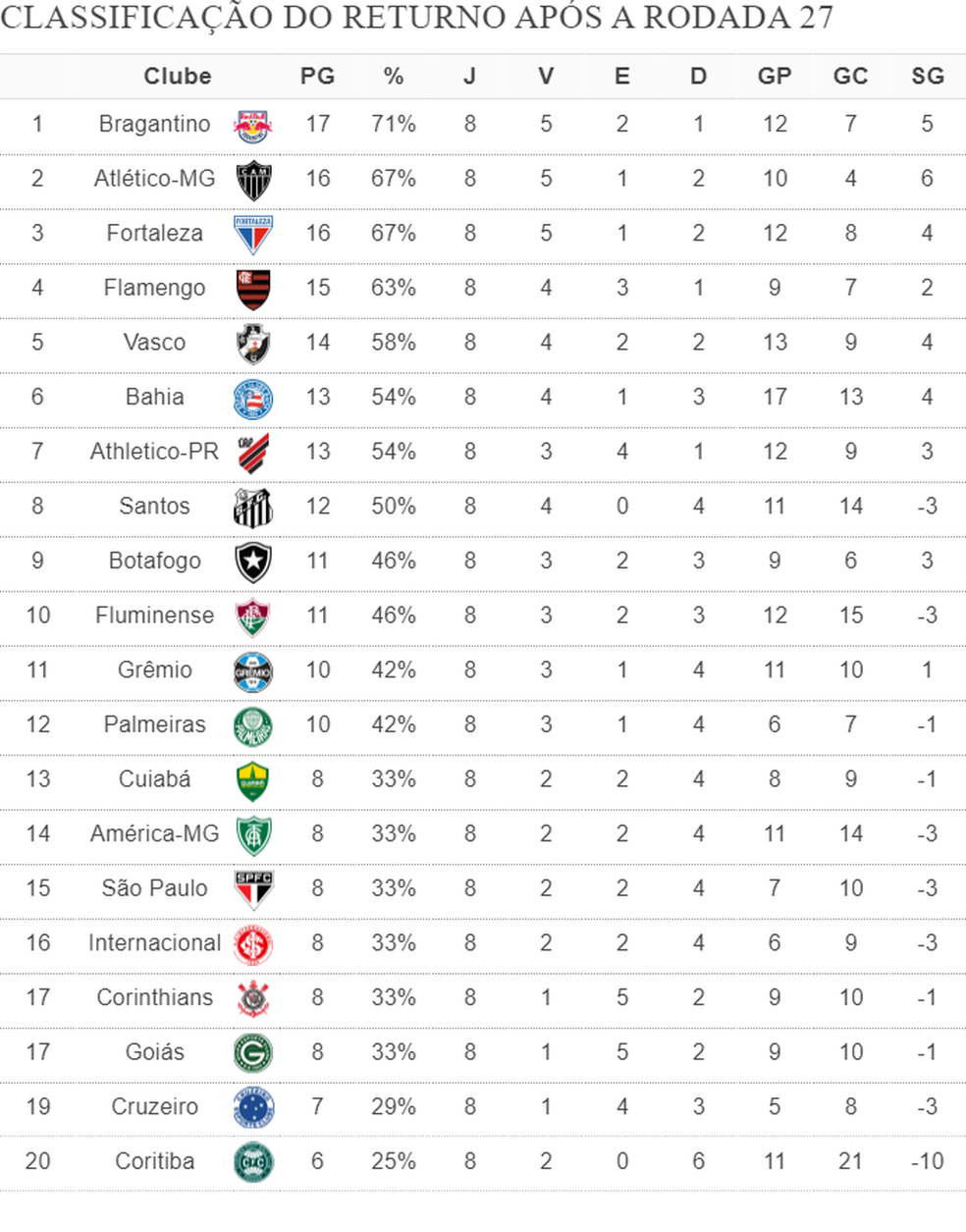 Veja abaixo como ficou a classificação do returno após a rodada 27:
