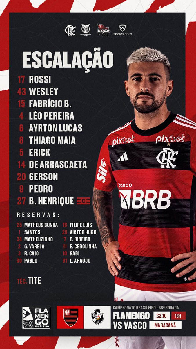 22/10/23 - Confira a escalação do Vasco para o jogo contra o Urubu