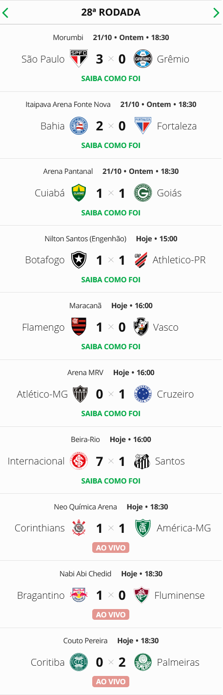 Terminada a 28ª rodada do Campeonato Brasileiro, o Vasco, que perdeu para o Flamengo por 1 a 0, está na 17ª colocação, na zona de rebaixamento. O Vasco está a 1 ponto do 1º time fora do Z4, que é o Goiás.