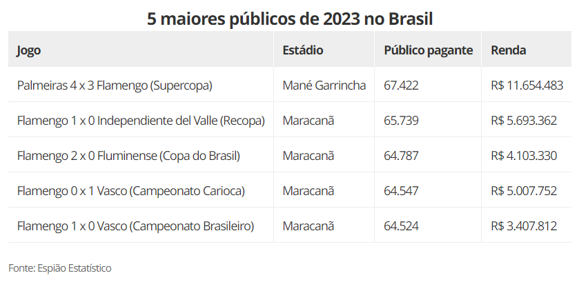 Este foi o quinto maior público da temporada. A final da Supercopa do Brasil entre Palmeiras e Flamengo teve 67.422 pagantes, recorde do ano até aqui. Confira o top 5 do ano no Brasil: