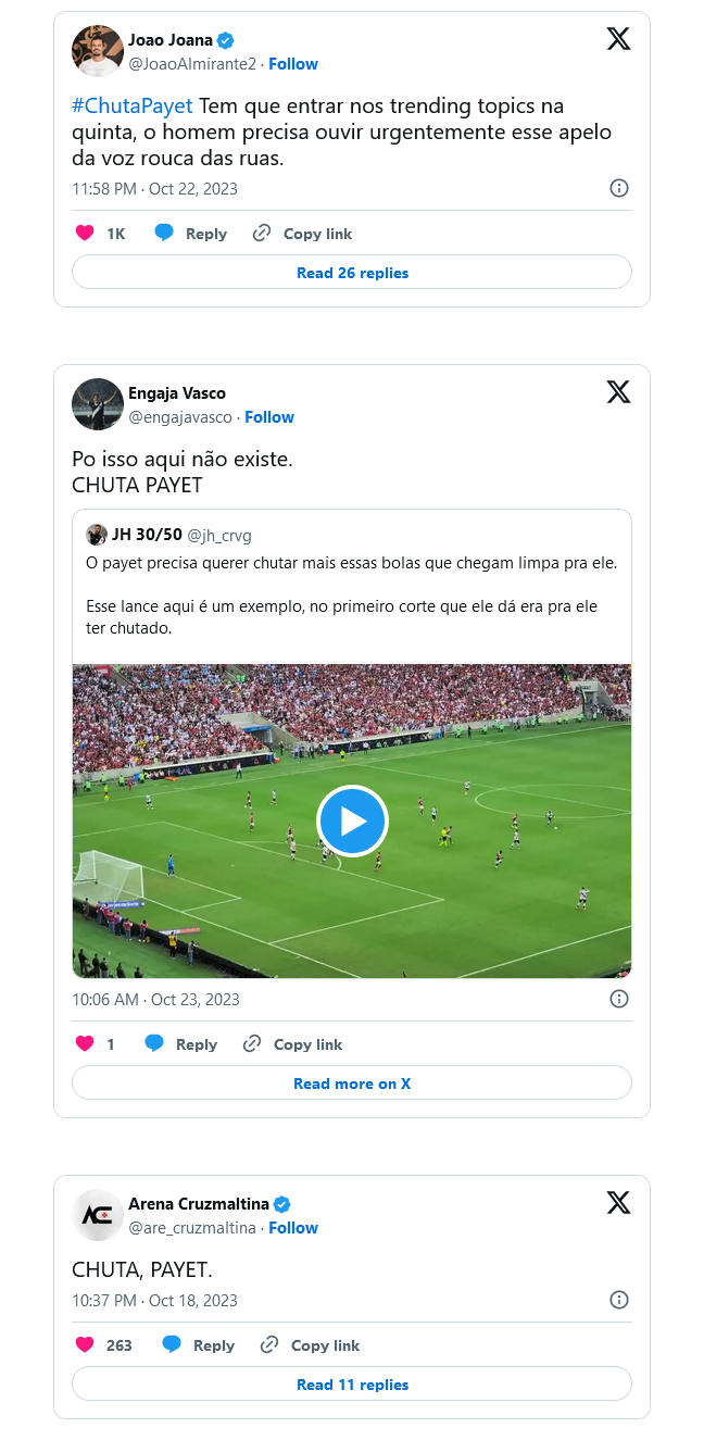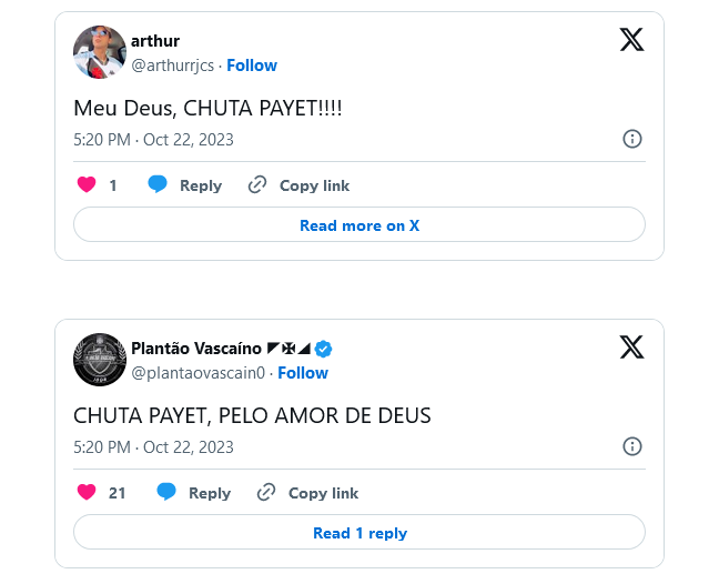 A atuação do meia foi aprovada pela torcida, mas a campanha "#ChutaPayet" já é realidade nas redes sociais. Na expectativa de mais um gol do francês, o Vasco volta a campo na próxima quinta-feira, às 19h, em São Januário, para enfrentar o Internacional.