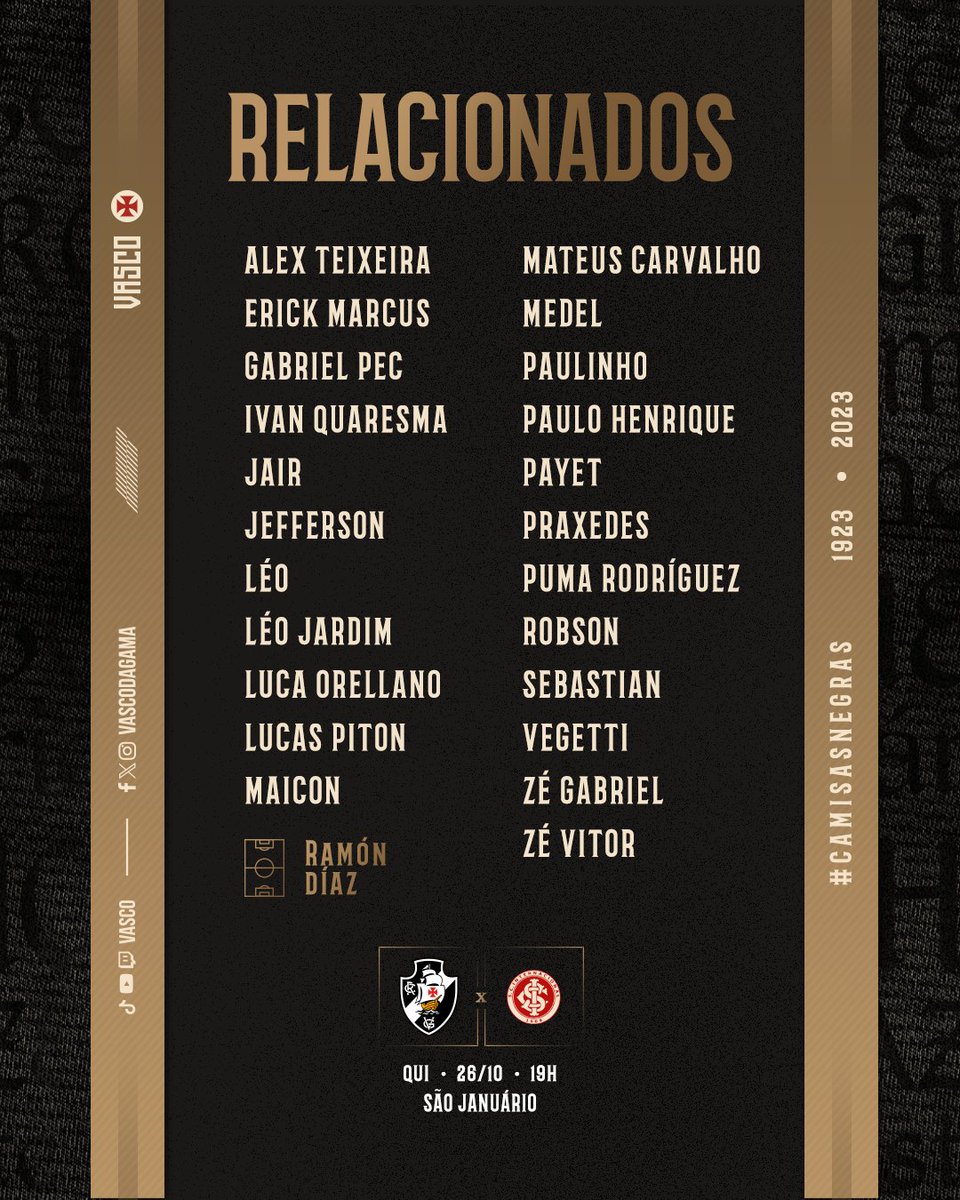📋 Relacionados para a partida desta noite em São Januário! 💢