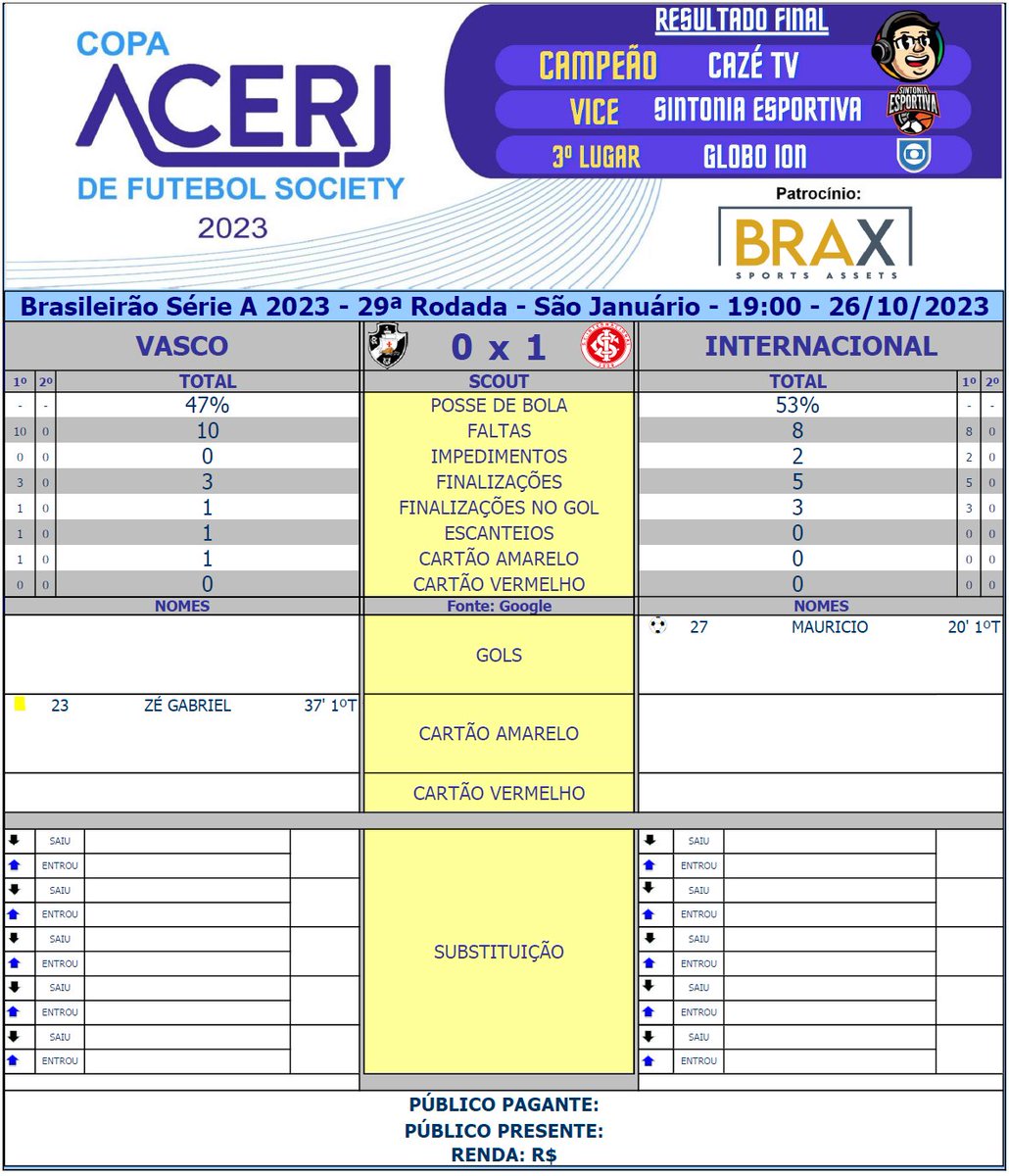 Scout do 1º Tempo de Vasco e Internacional pela 29ª Rodada do Campeonato Brasileiro 2023 em São Januário (Fonte: Google) #Acerjinforma #Brasileirao #VASxINT #Vasco #SCInternacional @Brasileirao @VascodaGama @SCInternacional