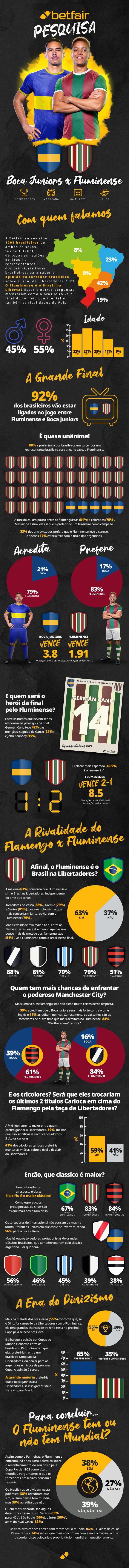Para esquentar o embate entre Fluminense e Boca Juniors, que acontecerá no Maracanã, a Betfair realizou uma pesquisa sobre a preferência do torcedor brasileiro quanto ao jogo decisivo no Rio de Janeiro.