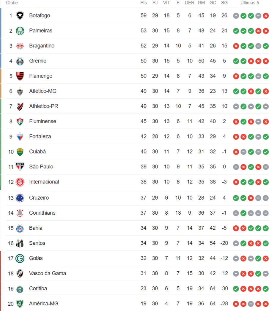 Veja a classificação do Brasileiro após os jogos deste domingo da 30ª rodada; Vasco segue em 18º lugar