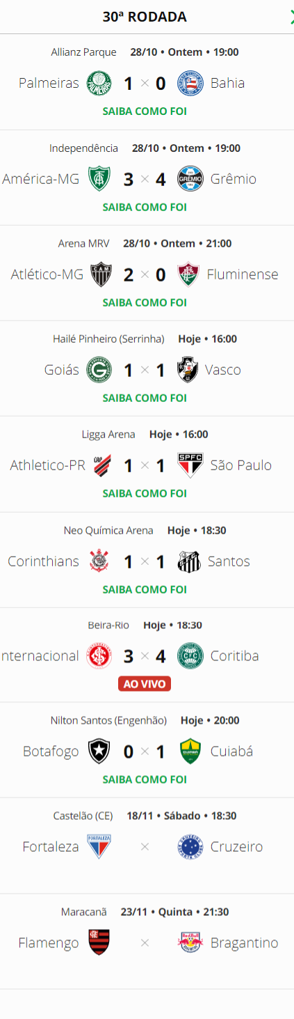 Confira os resultados dos jogos deste sábado da 30ª rodada. O Vasco, que empatou com o Goiás por 1 a 1, em Goiânia, segue na 18ª colocação e a 3 pontos do 16º colocado, que é o Santos. Dois jogos da rodada foram adiados e só serão disputados no final de novembro.