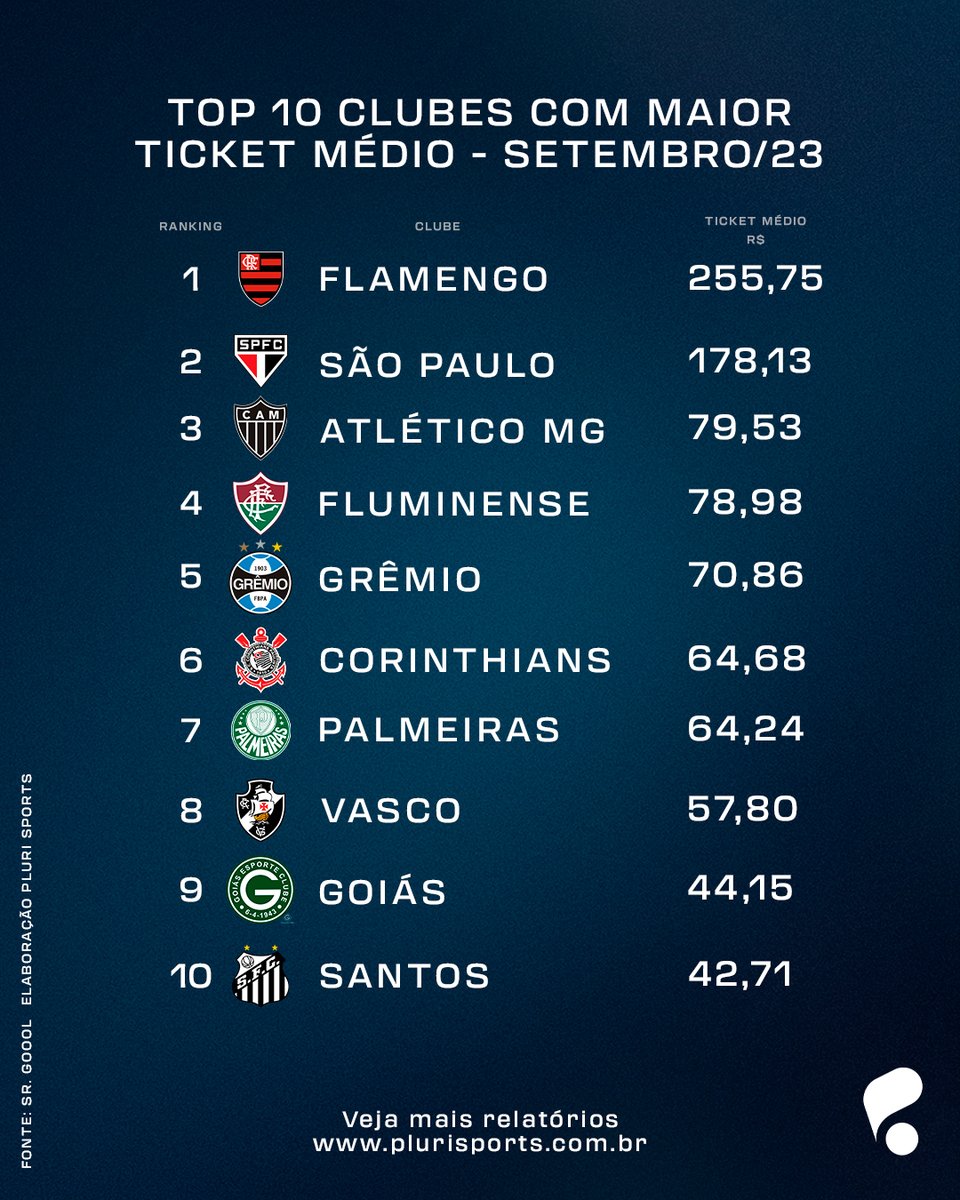 O Flamengo encerrou o mês de setembro com um ticket médio de R$255,75, o mais alto entre todos os clubes analisados, graças às suas três partidas como mandante pela Copa do Brasil e Série A.