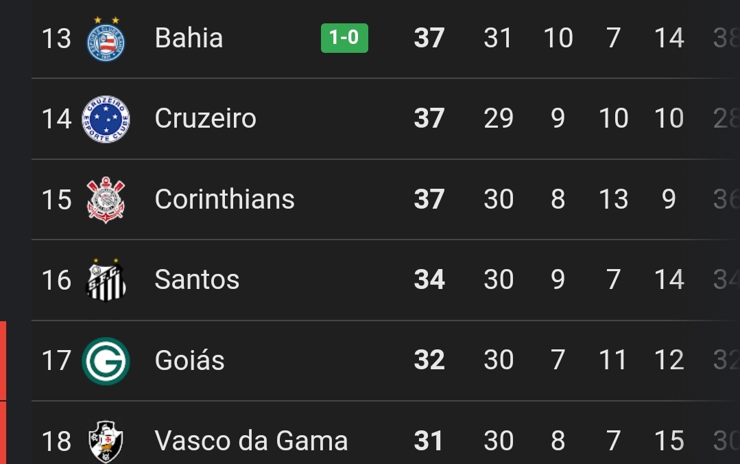 Bahia, Cruzeiro e Corinthians conseguiram se distanciar do z4.