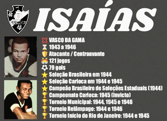 Isaías Benedicto, ídolo no início do Expresso da Vitória e dos maiores centroavantes da sua geração. Faleceu em 1947 aos 25 anos (tuberculose) e décadas depois surgia seu bisneto, o Léo Lima (oriundo tbm do Madureira e campeão no Vasco). Dia 27/10 foi 102 anos do seu nascimento.