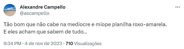 - Tão bom que não cabe na medíocre e míope planilha roxo-amarela. E eles acham que sabem de tudo… - escreveu Campello no Twitter.