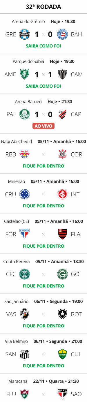 A 32ª rodada do Campeonato Brasileiro se iniciou neste sábado com 3 jogos. A vitória do Grêmio sobre o Bahia manteve o time baiano a 3 pontos do Vasco, que é o 17º colocado. A vitória do Palmeiras sobre o Athletico-PR fez a equipe paulista empatar em pontos com o Botafogo, que chegou a ter 13 pontos de vantagem na liderança da competição e é o adversário do Gigante da Colina na 2ª-feira, às 19h, em São Januário.
