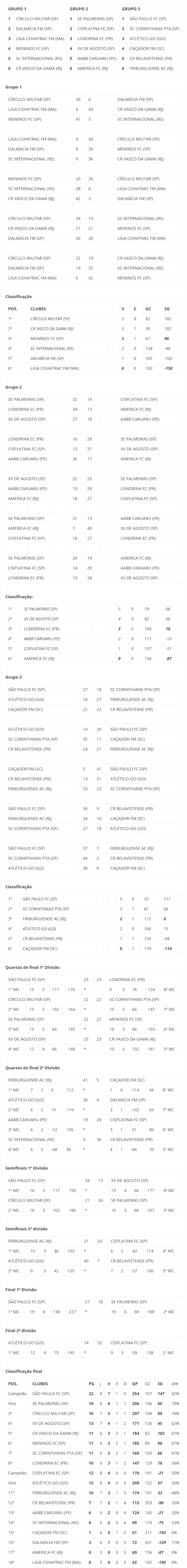 O São Paulo venceu o Palmeiras na final da categoria adulto enquanto o CEPE 2004 venceu o São Paulo na final da categoria máster e foram os campeões brasileiros de 2023.