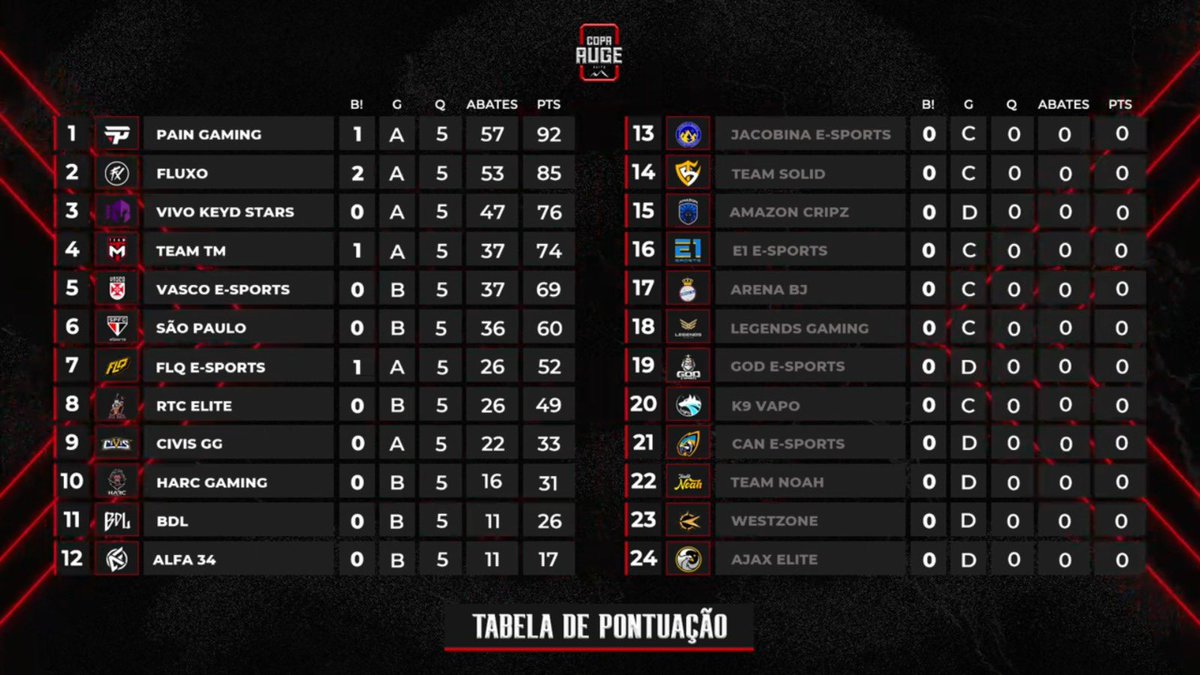 [FreeFire] E assim ficou a tabela da Copa Auge Elite Season 3, após o primeiro dia e com 5 quedas