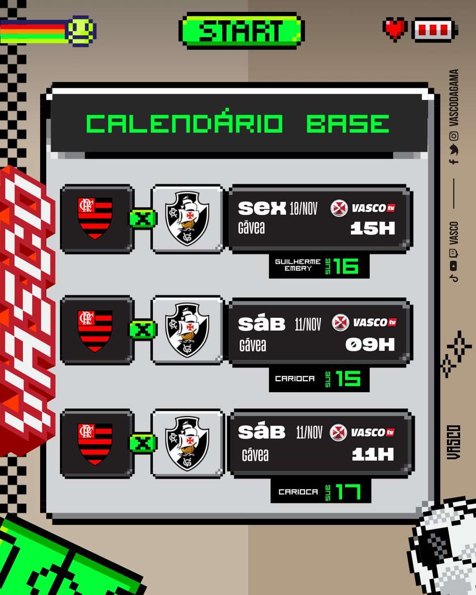VascoTV transmite Urubu x Vasco por 3 categorias na 6ª-feira e no sábado: Sub-15, Sub-16 e Sub-17