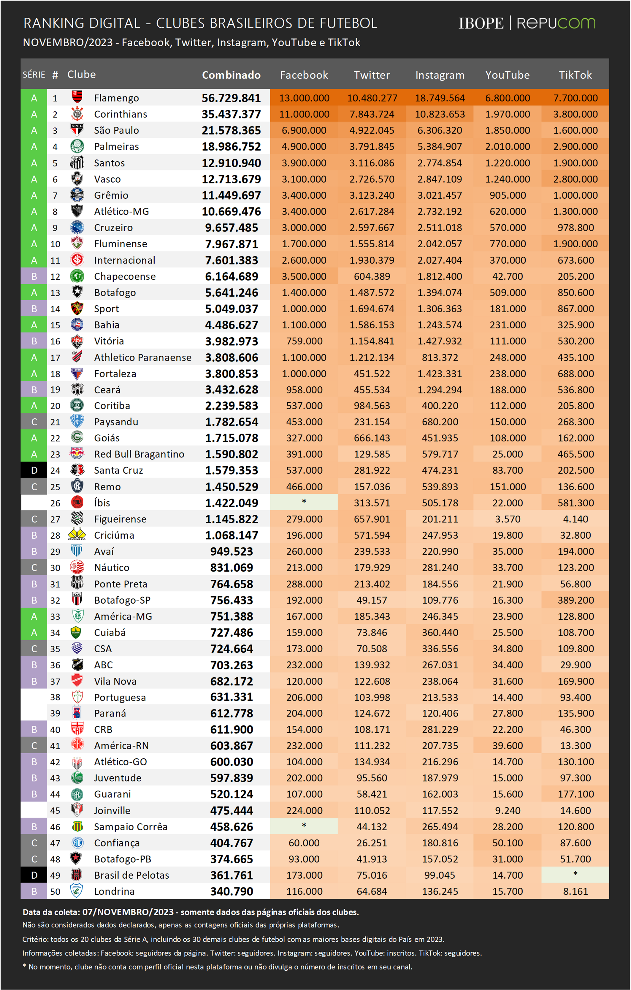 Na edição atual do Ranking Digital dos Clubes Brasileiros, o IBOPE Repucom destaca o desempenho mensal no volume de novos inscritos nas redes sociais. Os 50 clubes considerados no estudo acumularam um total de 2,9 milhões de seguidores durante o período, e os cinco que mais se destacaram foram: Fluminense, Flamengo, Palmeiras, Santos e Corinthians. Juntos, foram responsáveis por cerca de 1,9 milhão de novas inscrições, ou 66% do total entre todos os 50 clubes no período.