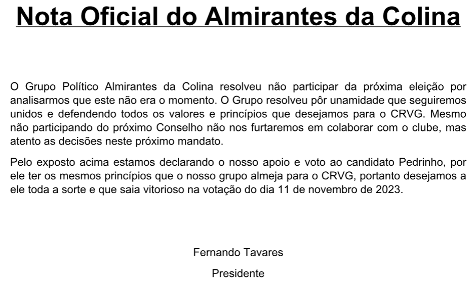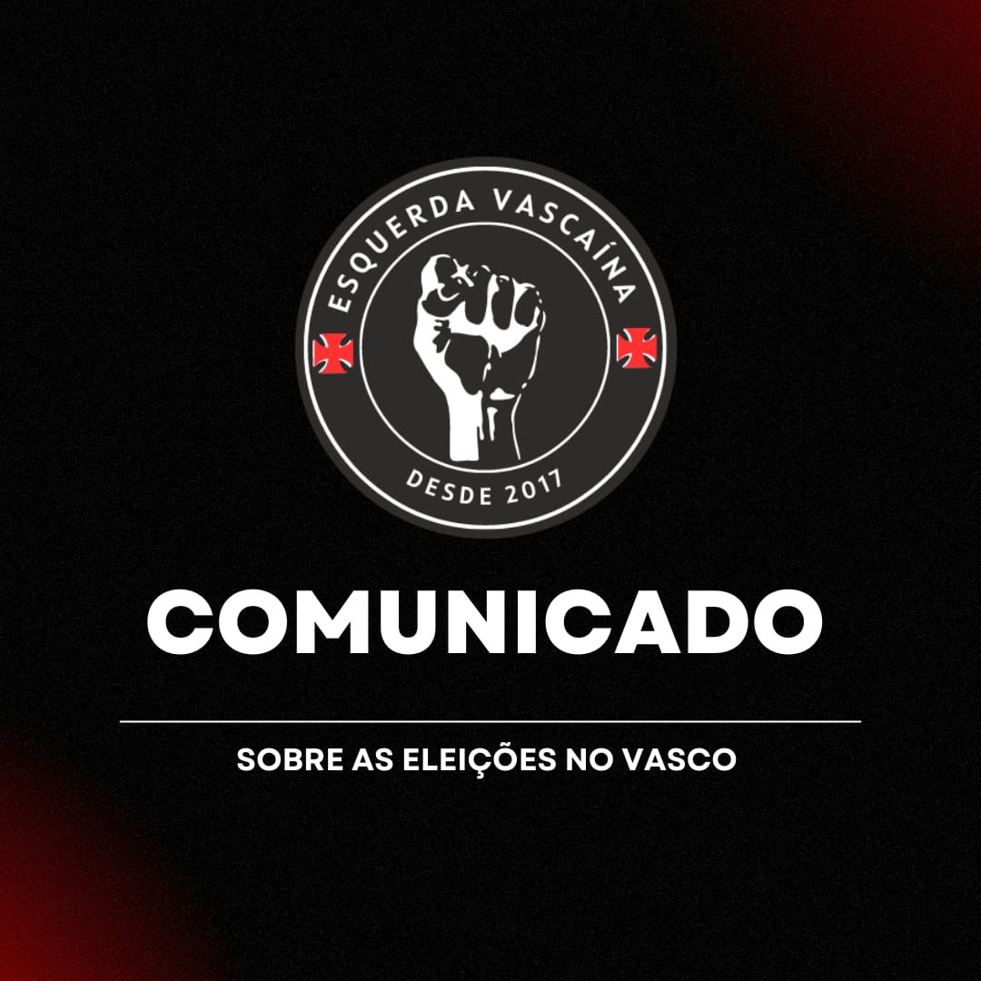 a Esquerda Vascaína anuncia que não apoiará candidatos ou projetos neste próximo pleito, ficando seus membros livres para demonstrarem apoio para seus candidatos, o que não significará posicionamento do Coletivo. +