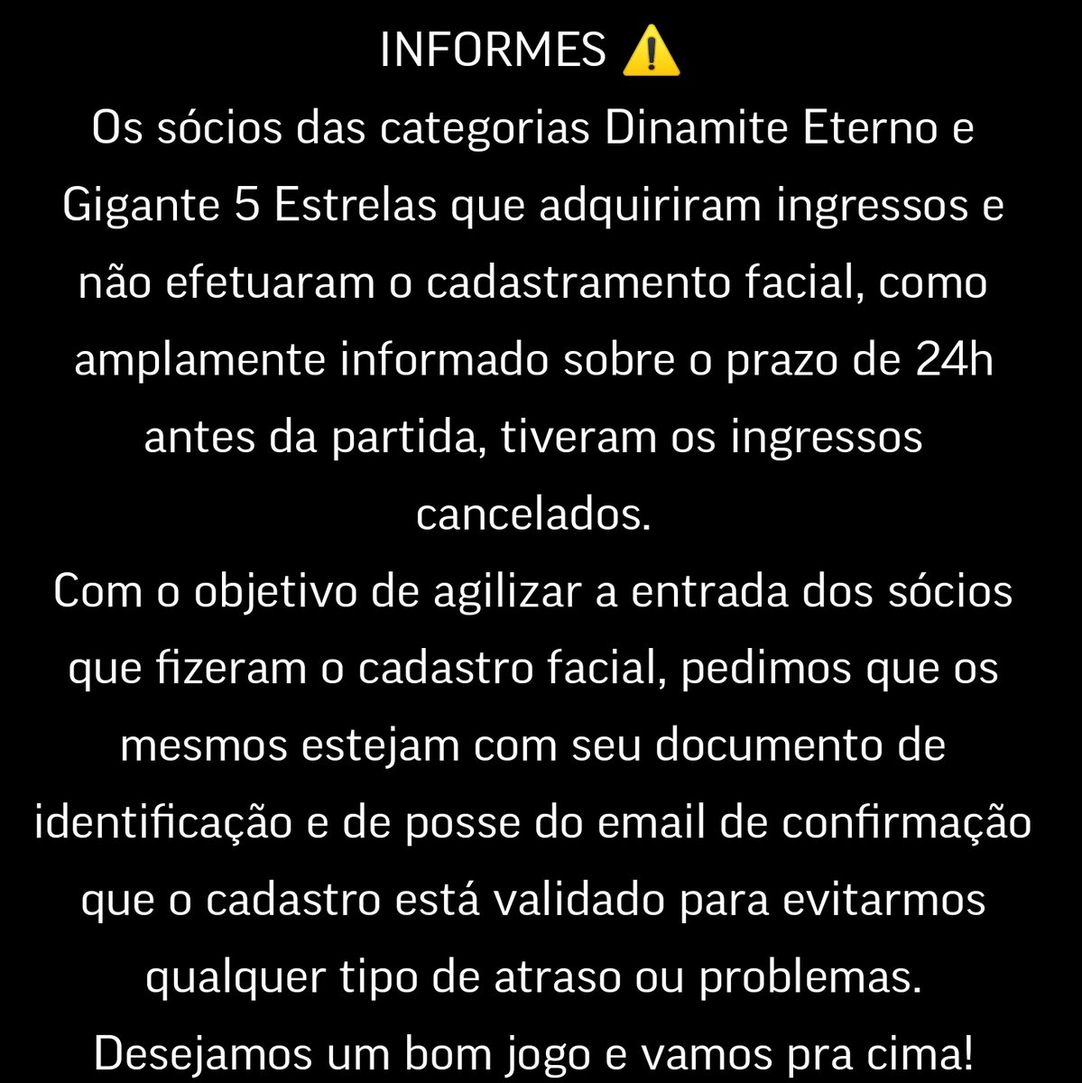 Sócios das categorias Dinamite Eterno e Gigante 5 Estrelas que não efetuaram cadastramento facial tiveram seus ingressos cancelados