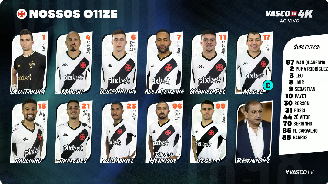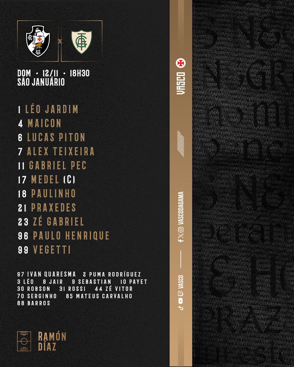 Confira a escalação do Vasco para o jogo contra o América-MG; Alex Teixeira é titular no lugar de Erick Marcus