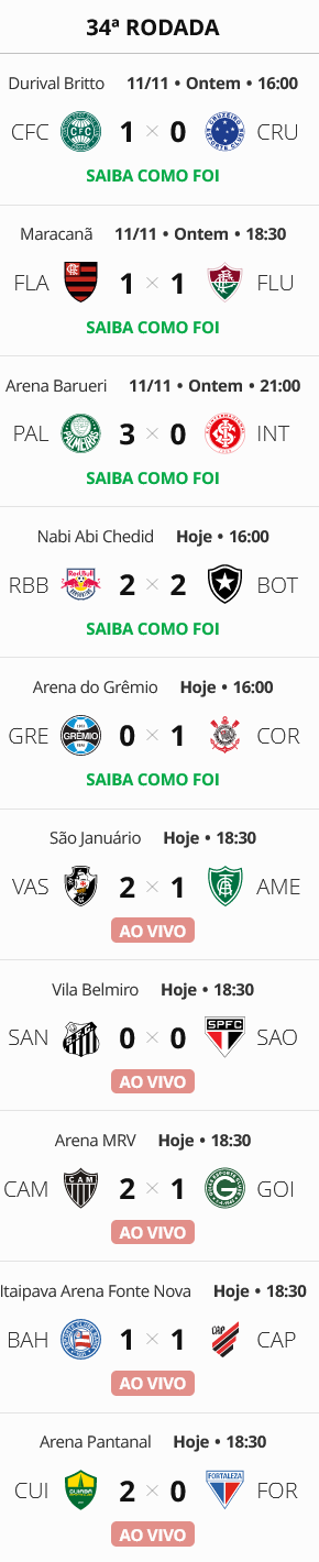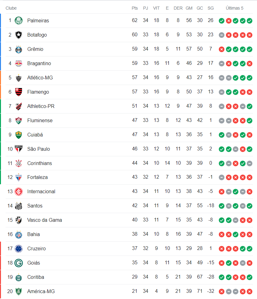 Terminada a 34ª rodada do Campeonato Brasileiro, o Vasco, que derrotou o América-MG por 2 a 1, está na 15ª colocação e fora da zona do rebaixamento. O Gigante da Colina tem um jogo a menos do que a maioria dos outros times, pois teve sua partida contra o Cruzeiro adiada.
