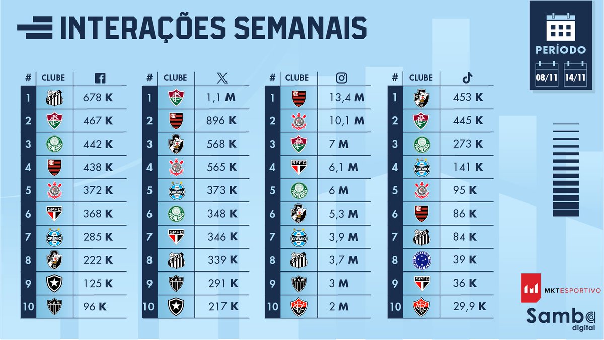 Líderes: @Flamengo no Instagram, @FluminenseFC no Twitter, @SantosFC no Facebook e @VascodaGama no TikTok.