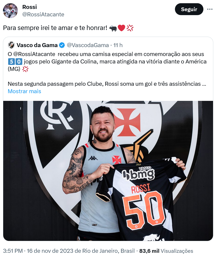 Rossi agradece homenagem pelos 50 jogos no Vasco: 'Para sempre irei te amar e te honrar!'