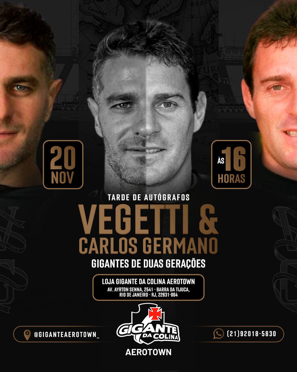 Vegetti e Carlos Germano estarão na loja do Vasco no Aerotown nesta 2ª-feira às 16h