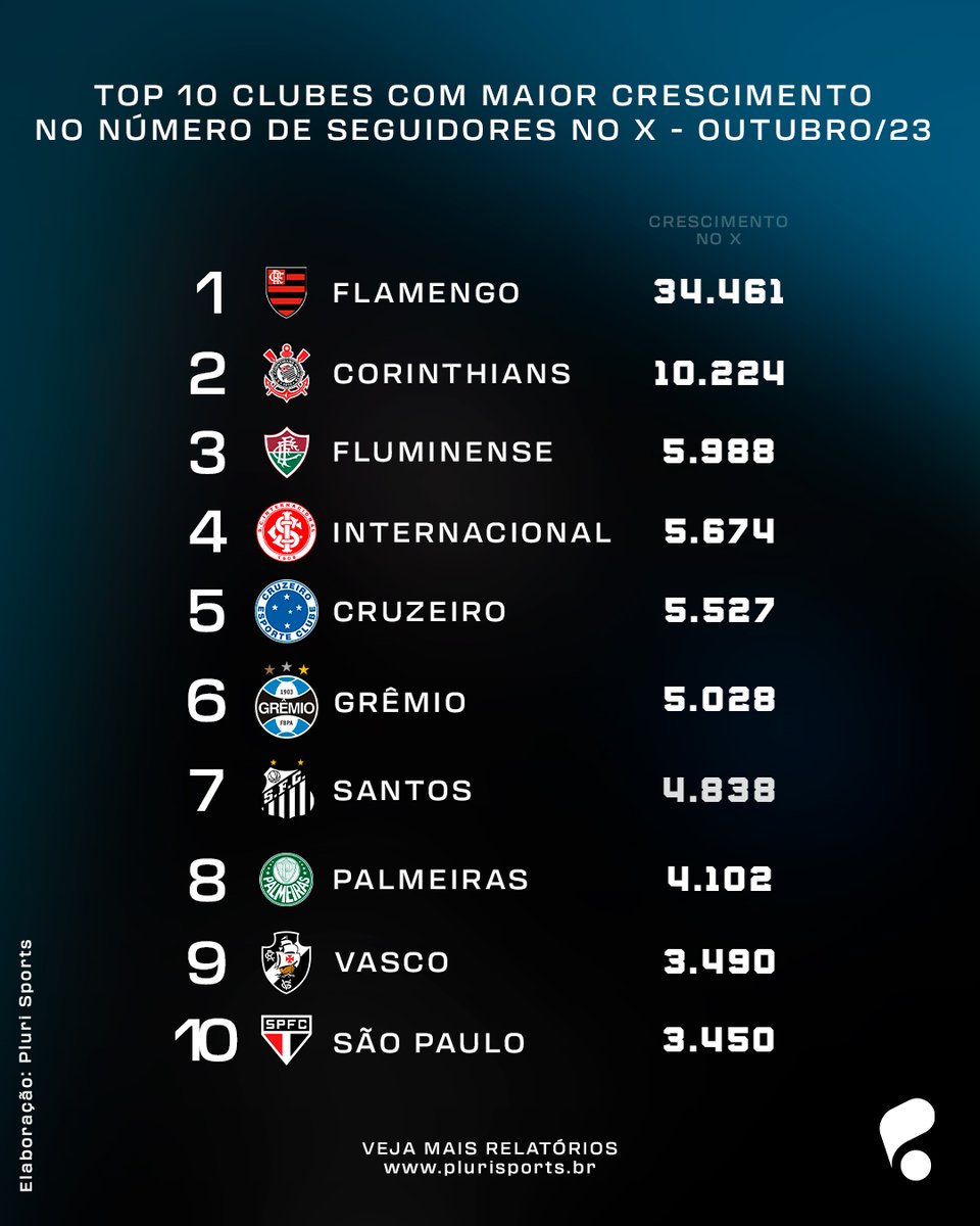 Flamengo e Corinthians destacaram-se como os únicos entre os clubes analisados a receber mais de 10 mil novos seguidores em um único mês no X (antigo Twitter), ocupando a primeira e segunda posição do ranking, respectivamente.
