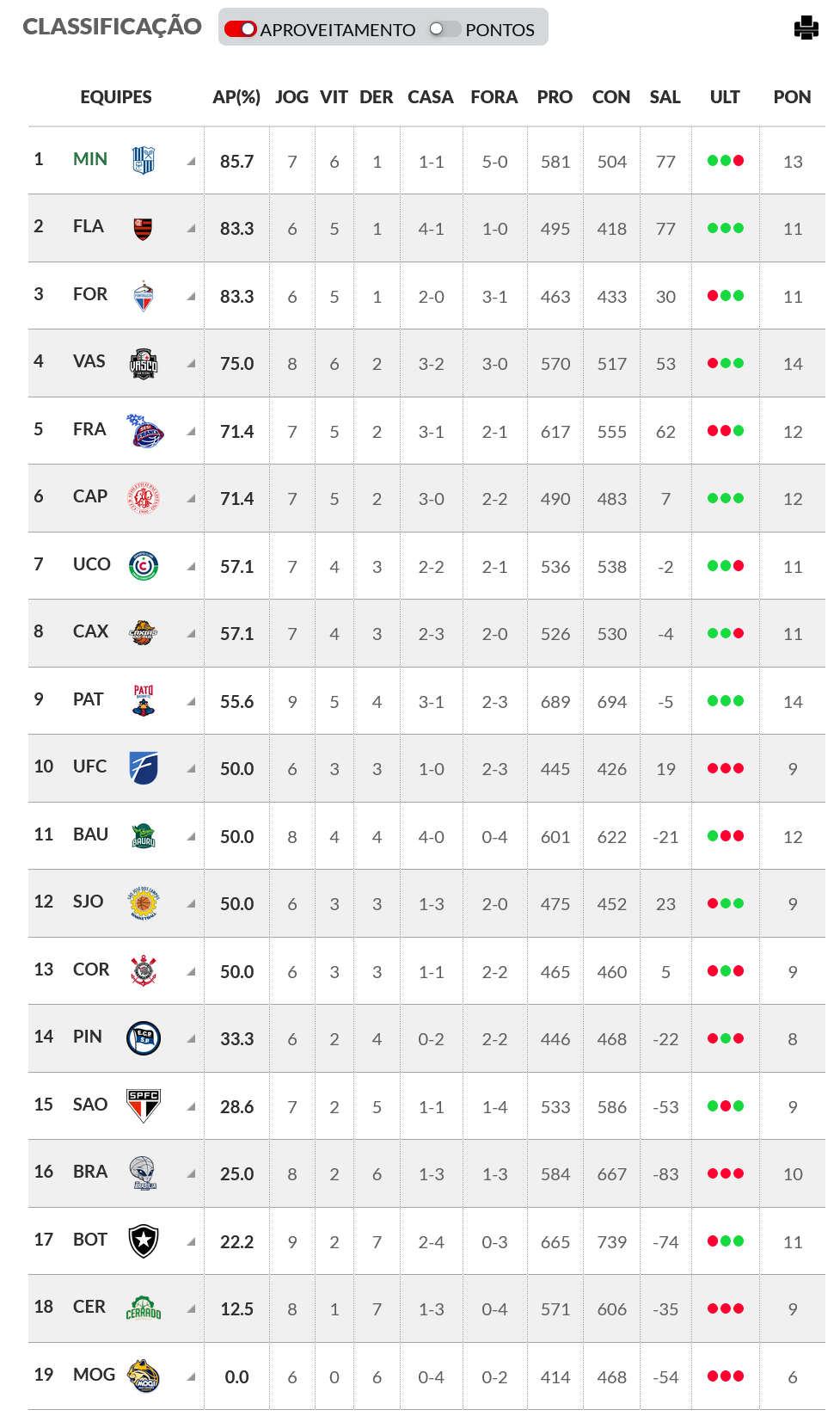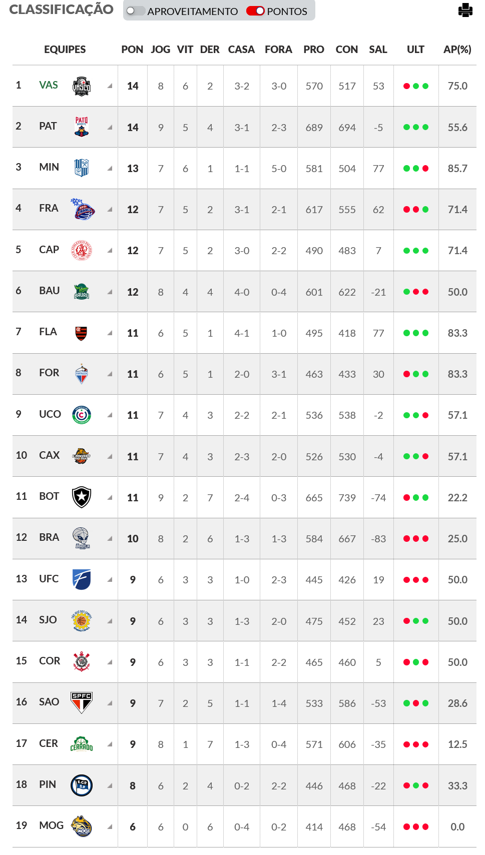 Após 8 jogos pela 1ª fase do NBB, o Vasco é o líder por pontos e o 4º colocado por aproveitamento. Veja abaixo a classificação por cada critério.