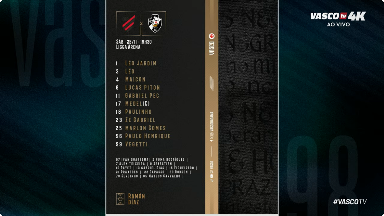 GIGANTE DA COLINA DEFINIDO PELO TÉCNICO RAMÓN DÍAZ! 💢🎥 Escalação em ordem numérica.#CAPxVAS#EscalaçãoVasco#VascoDaGama pic.twitter.com/ZVO1K91Q0O— Vasco da Gama (@VascodaGama) November 25, 2023