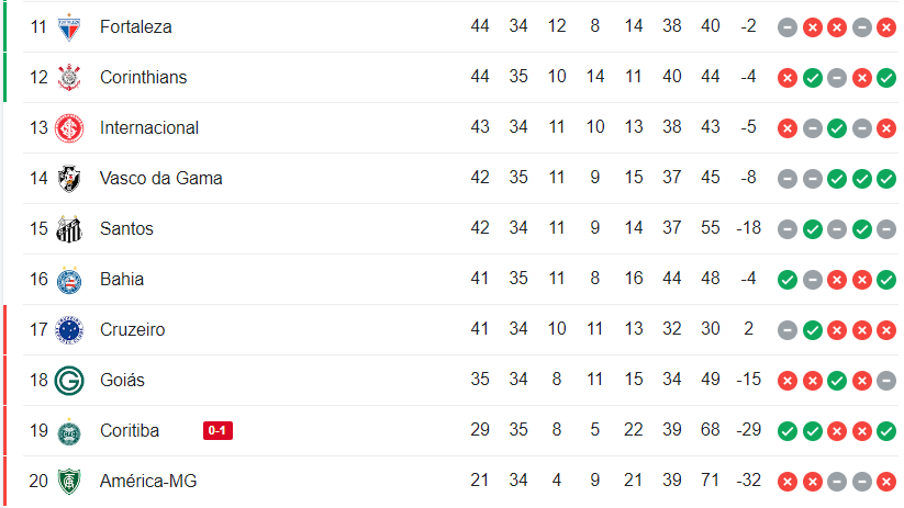 Vasco não terminará a 35ª rodada do Brasileiro na zona do rebaixamento