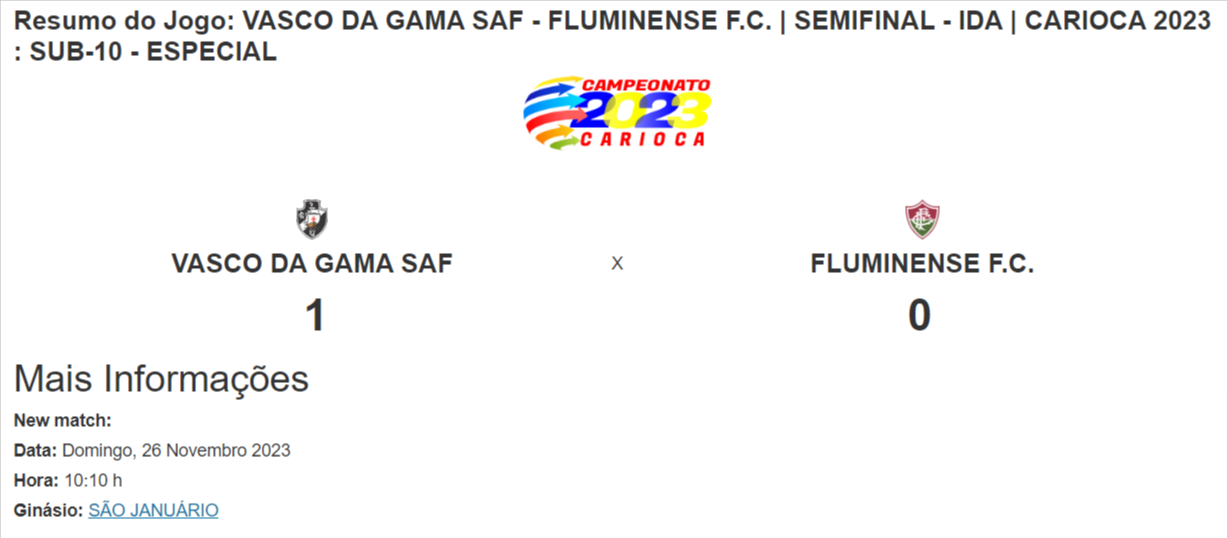 Jogando em São Januário, a equipe Sub-10 do Vasco venceu o Fluminense por 1 a 0 no jogo de ida da semifinal do Carioca Sub-10.