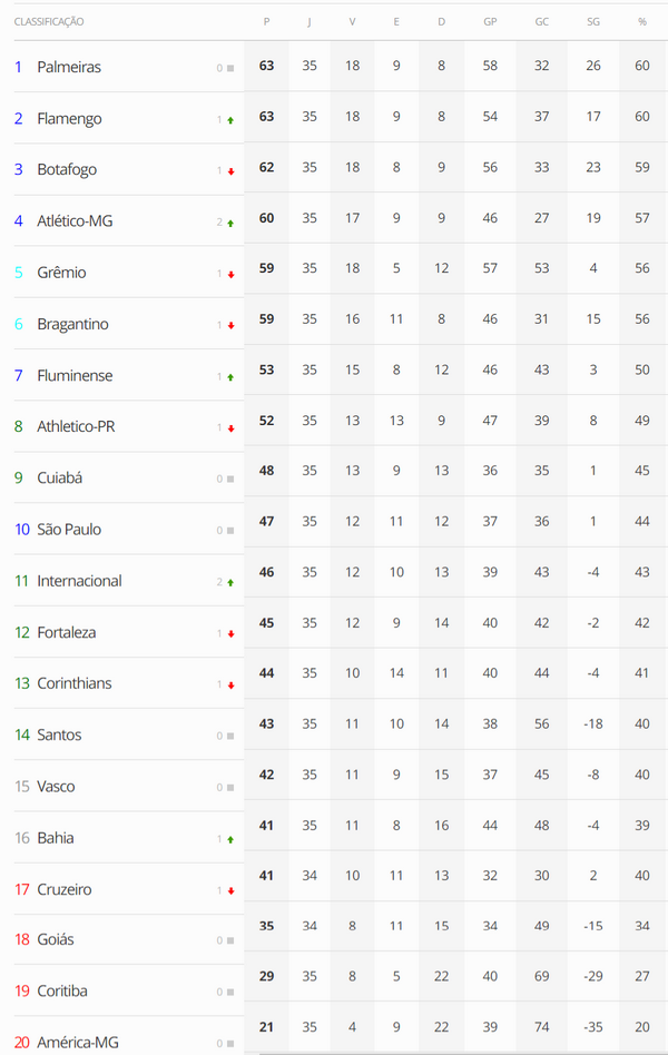 Faltando 1 jogo para o fim da 35ª rodada do Brasileiro, o Vasco está na 15ª posição e, portanto, fora da zona do rebaixamento. Goiás e Cruzeiro se enfrentam nesta segunda-feira e o time mineiro pode ultrapassar o Gigante da Colina na classificação.