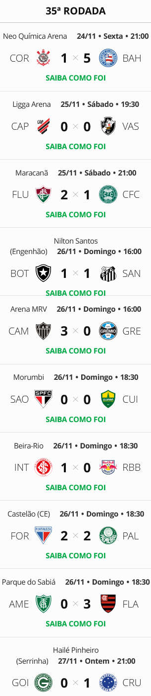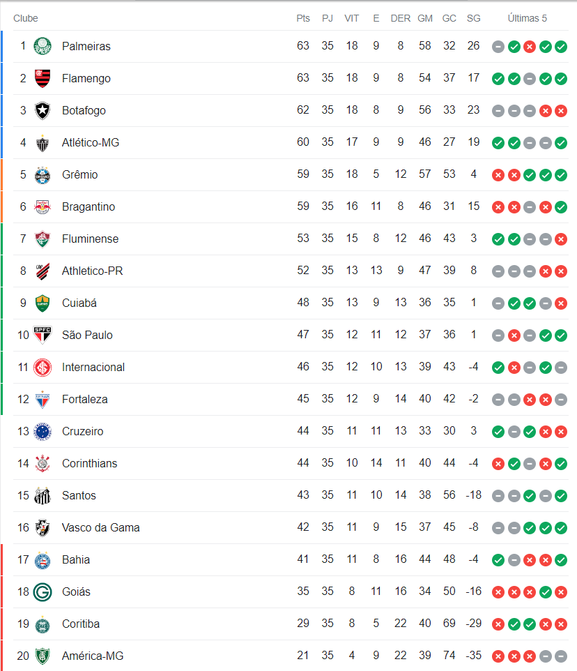 Terminada a 35ª rodada do Campeonato Brasileiro, o Vasco, que empatou com o Athletico-PR por 0 a 0, caiu para a 16ª colocação, mas segue fora do Z4. O Gigante da Colina já abre a 36ª rodada nesta 3ª-feira, às 21h30, contra o Corinthians, em São Januário.