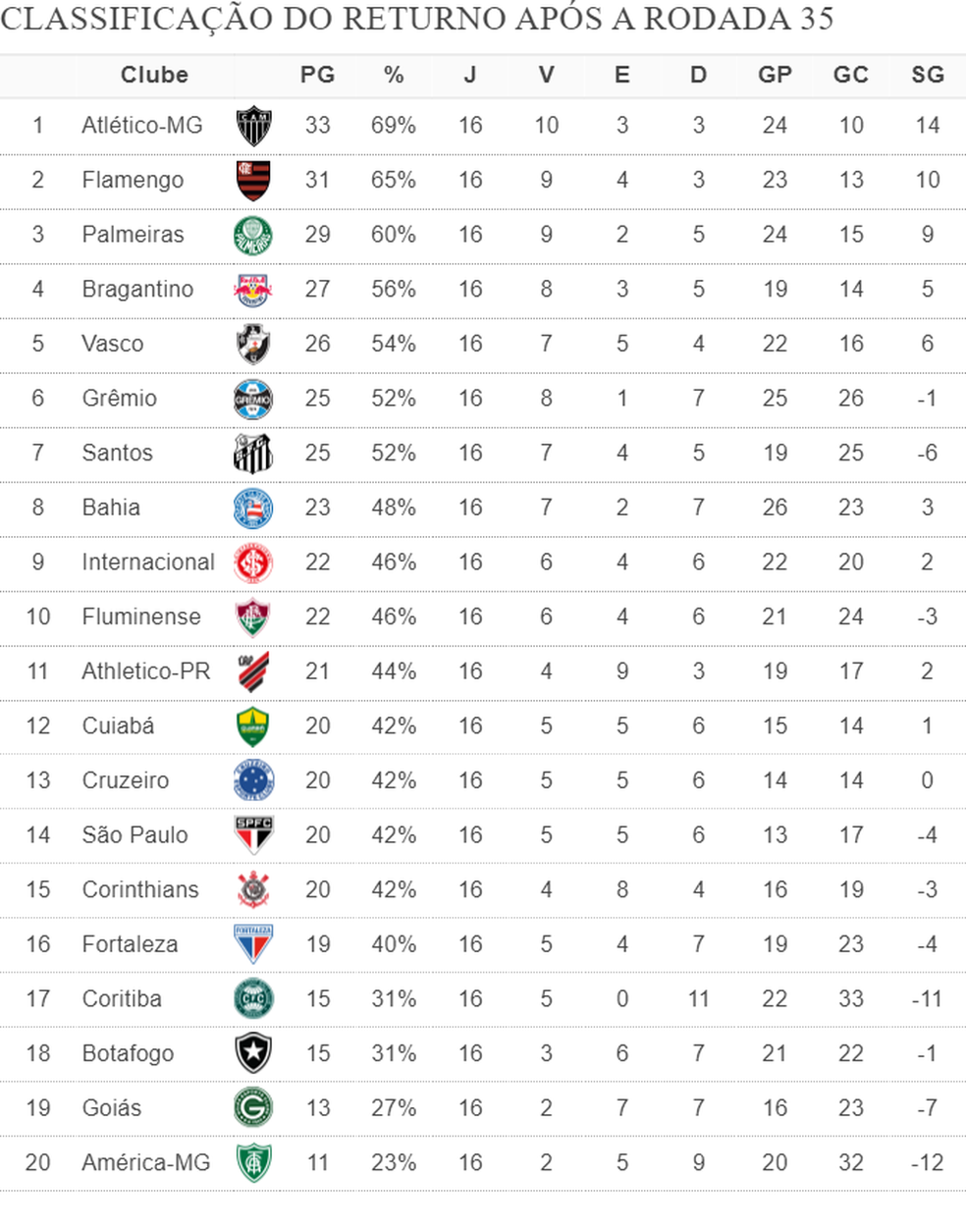 Com a vitória sobre o América-MG, o Flamengo superou o Palmeiras e passou a ter a segunda melhor campanha do segundo turno do Brasileirão, e com o empate fora de casa com o Athletico-PR, o Vasco superou o Grêmio, passando a ter a quinta melhor campanha do returno. O Atlético-MG lidera com 33 pontos e 69% de aproveitamento.