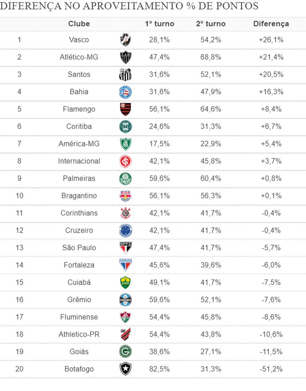 Veja abaixo a variação do desempenho de cada equipe no turno e no returno.